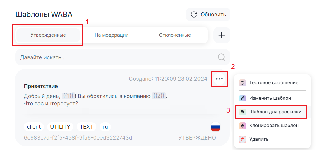 Подробнее о создании и настройке шаблонов — в статье Как создать шаблон сообщения WhatsApp Business API.