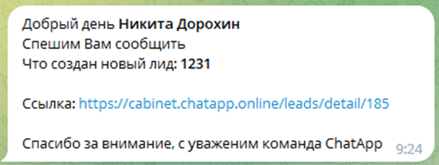 4. При появление нового лида в личном кабинете ChatApp на привязанный Telegram придет сообщение: