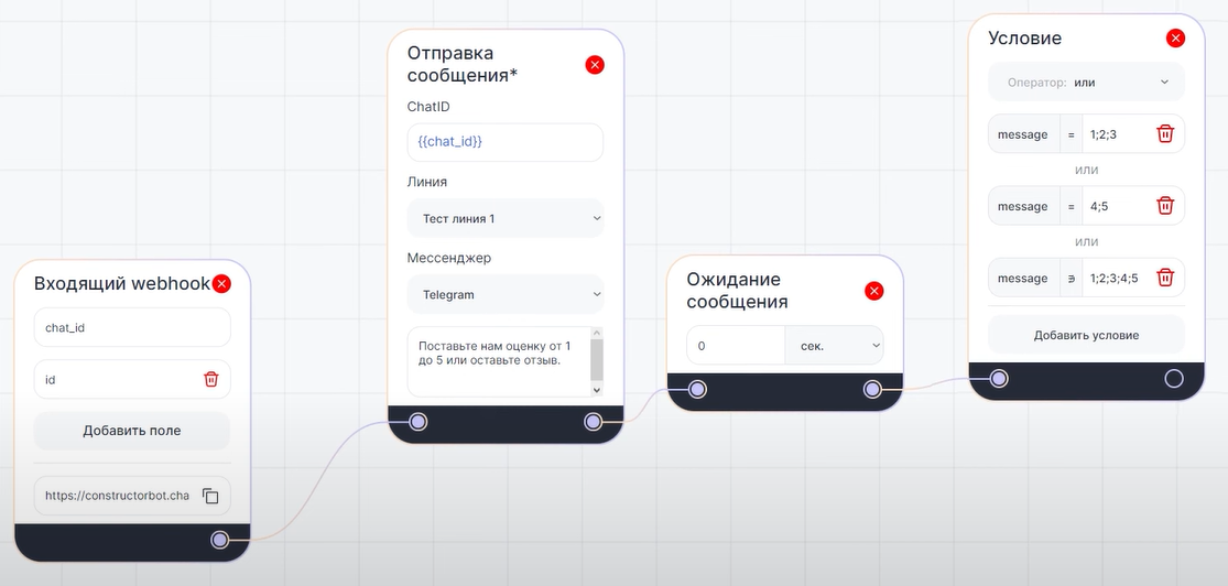 2. В блоке «Условие» указаны три варианта развития сценария в зависимости от выставленной клиентом оценки.