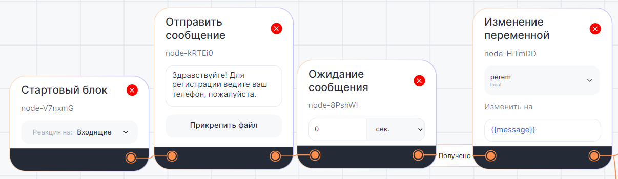 В диалоговом сценарии блок может понадобиться, чтобы отправить сообщение в определенный чат или мессенджер. В таком сценарии его можно использовать с блоком «Стартовый блок» и заполнить поле «ChatID» вручную.