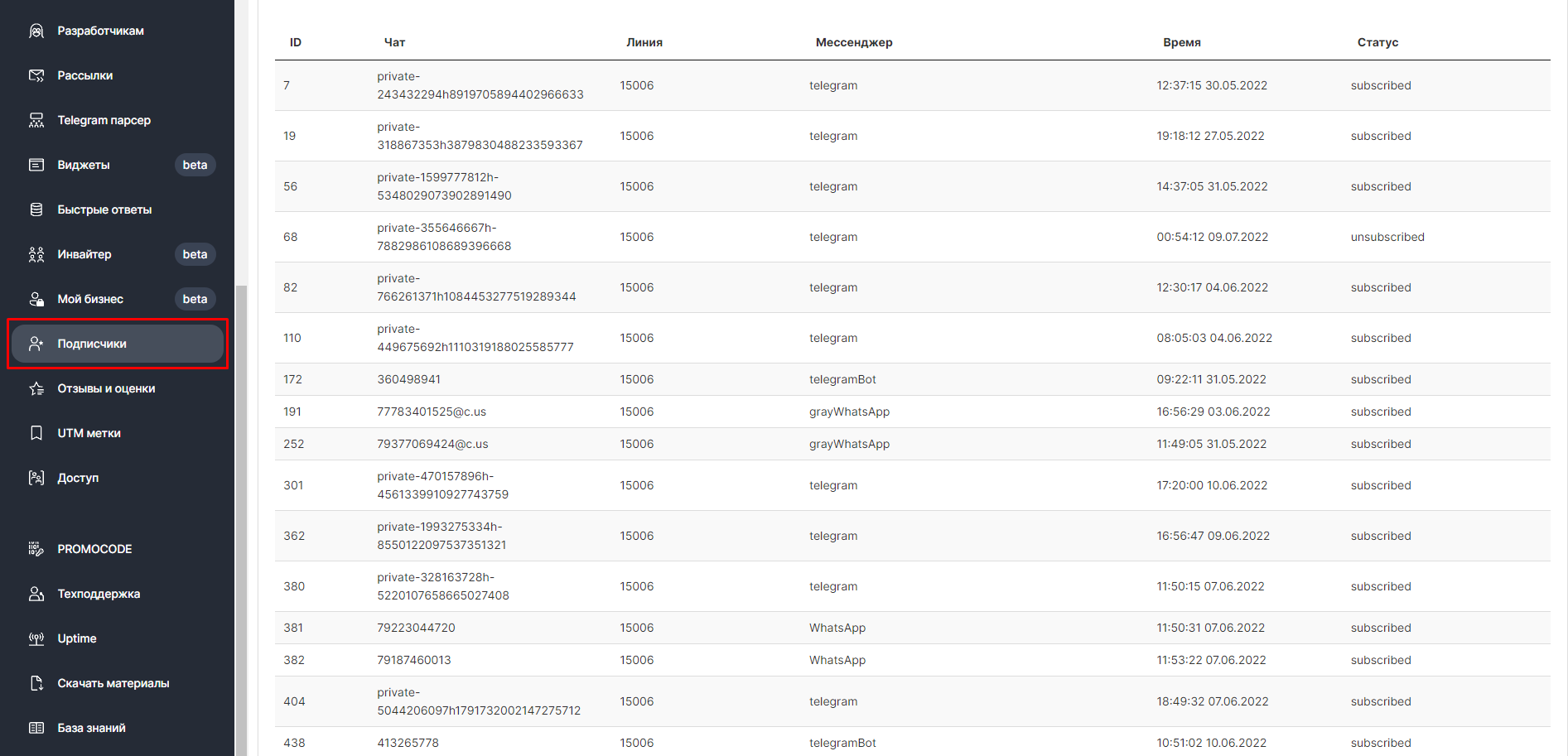 В таблице подписчиков закреплен ID подписчика; номер лицензии, которая использовалась при отправке предложения подписаться; мессенджер, через который была отправлена команда «/Подписаться» или «/Отписаться», а также статус.
