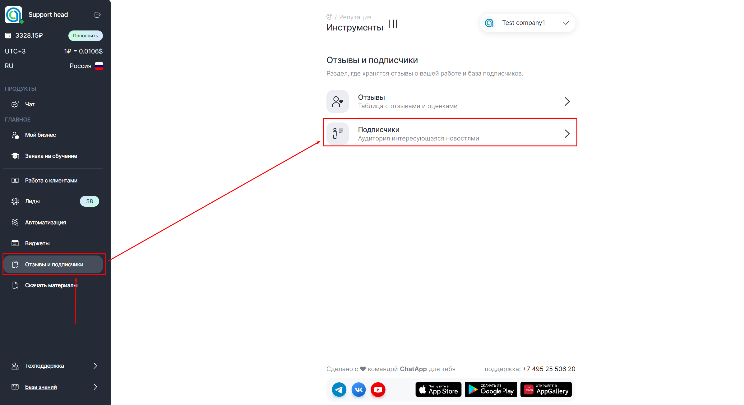 1. В меню выберите пункт «Отзывы и подписчики» и выберите «Подписчики».