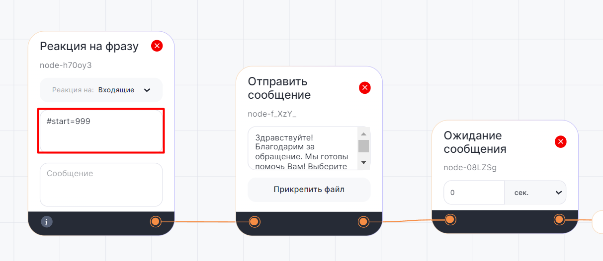 2. Когда клиент перейдет по глубокой ссылке, блок «Реакция на фразу» получит ключ «/start 999» и бот автоматически отправит сообщение клиенту в чате сообщества Вконтакте.