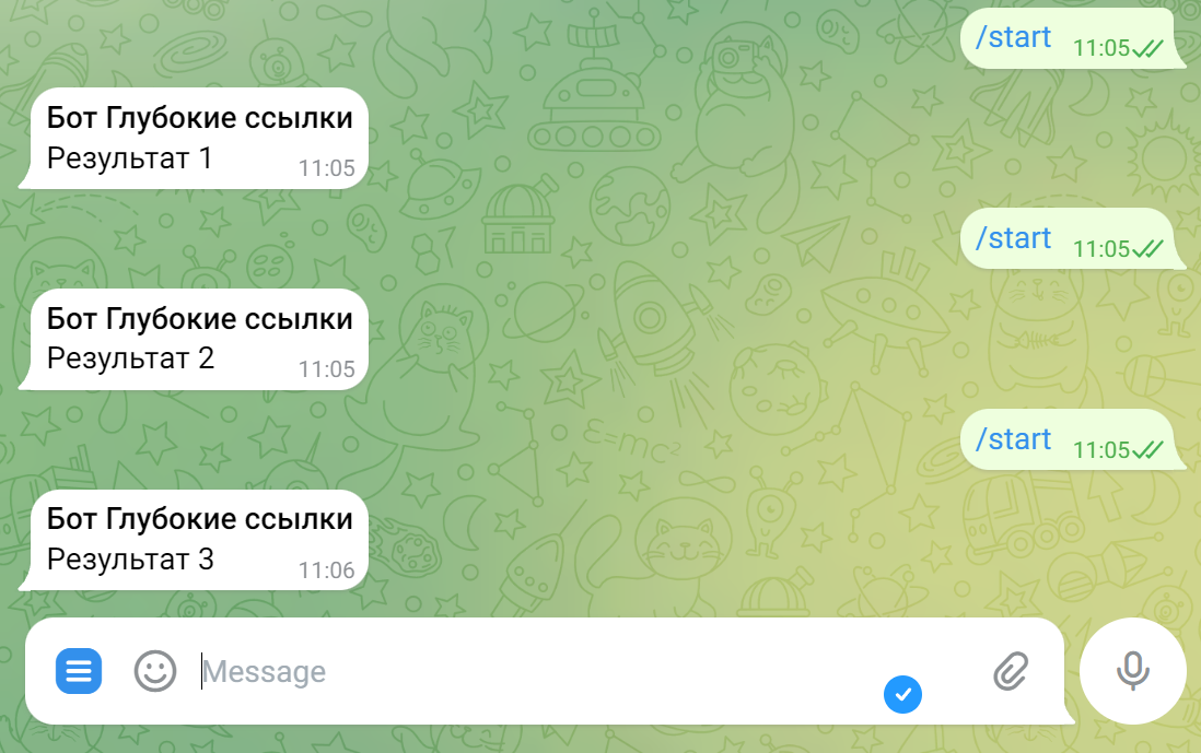 Также глубокая ссылка может вести на один из сценариев бота — подробнее об этом в статье Стартовый блок.