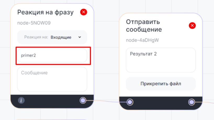 Когда клиент перейдет по глубокой ссылке, блок «Реакция на фразу» получит ключ «primer2». Клиент запустит диалог с Telegram Bot, и чат-бот автоматически отправит сообщение из сценария.