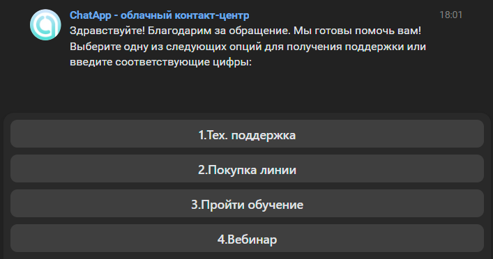 Привяжите линию ChatApp к аккаунту канала, на который будет вести глубокая ссылка. Она может направлять сразу в диалог, где чат-бот автоматически пришлет сообщение клиенту. В глубокую ссылку нужно вручную добавить ключ в соответствии с правилами: