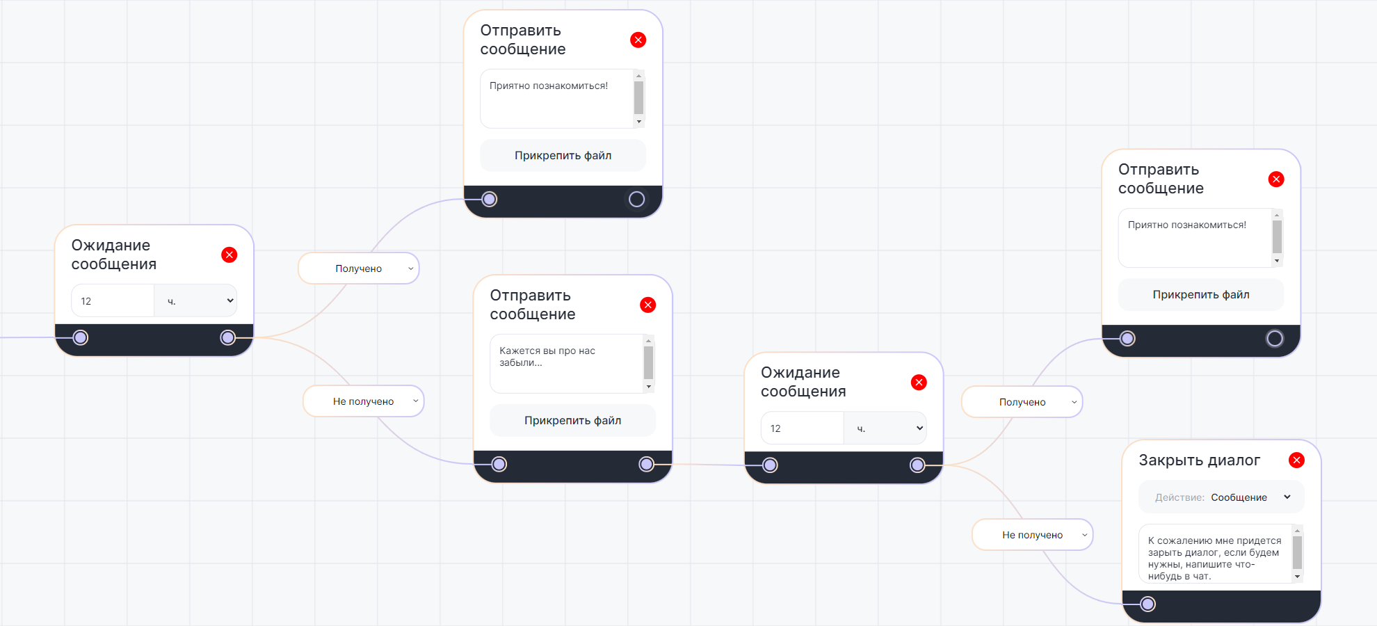 Из блока «Ожидание сообщения» можно вывести 2 стрелки. Стрелка «Получено» сработает если клиент ответил на сообщение. Стрелка «Не получено» сработает если выставленное вами время вышло, а клиент все еще не ответил.