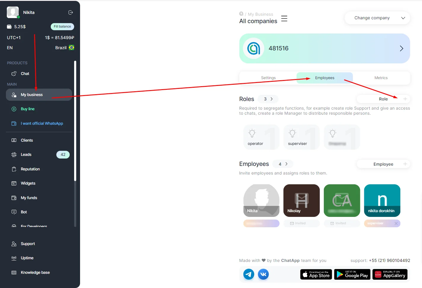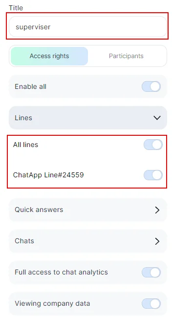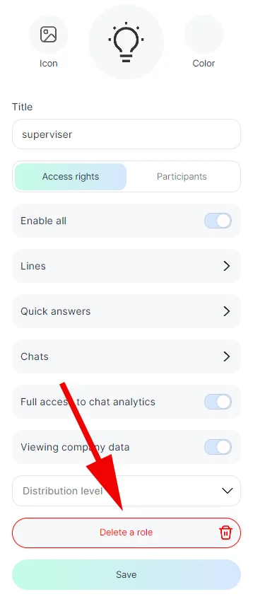 The first thing you do is to create a role. This is necessary to differentiate the functionality, for example, create an Operator role and give access to chats. Create a Manager role to assign responsibilities. Then invite employees and give them access to Operator or Manager.