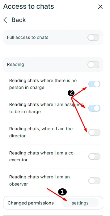 For example: in the Reading column you can give access to view some chats. The option on the screenshot makes it possible for the operator to read only those chats where they are assigned to be in charge or where there is no person in charge.