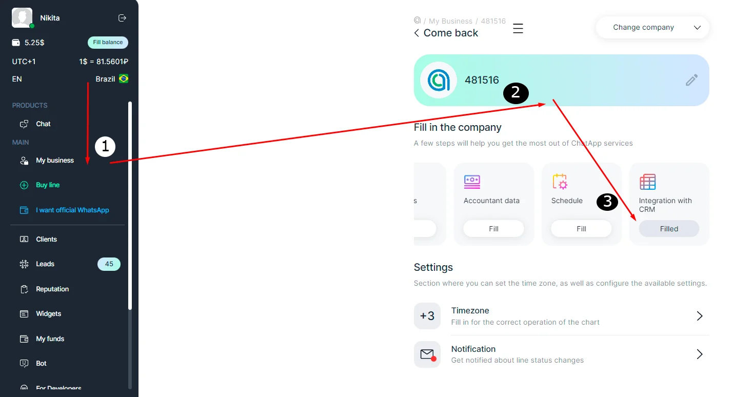 4. In the Link to CRM line, select the connected account you need. If the list is empty, check if ChatApp integration is enabled in CRM.