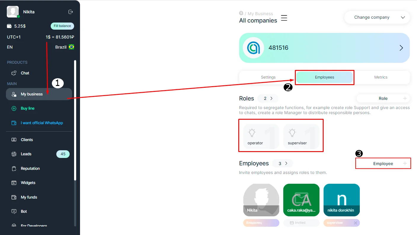 1. 1. Return to the Selected company section and go to the Employees tab.