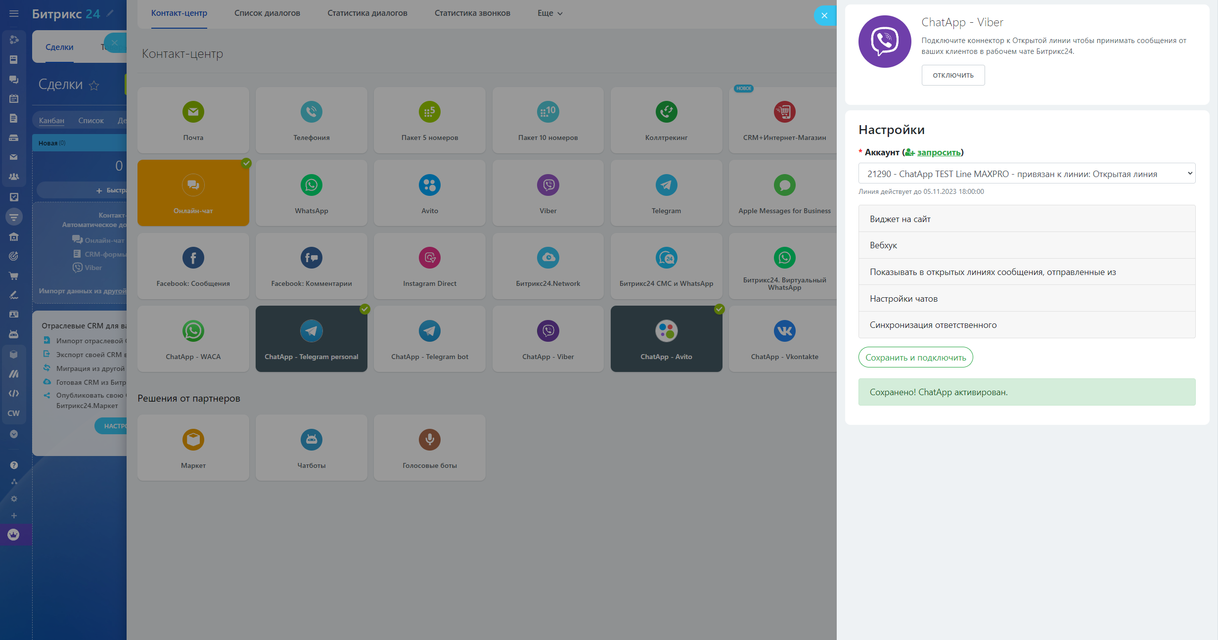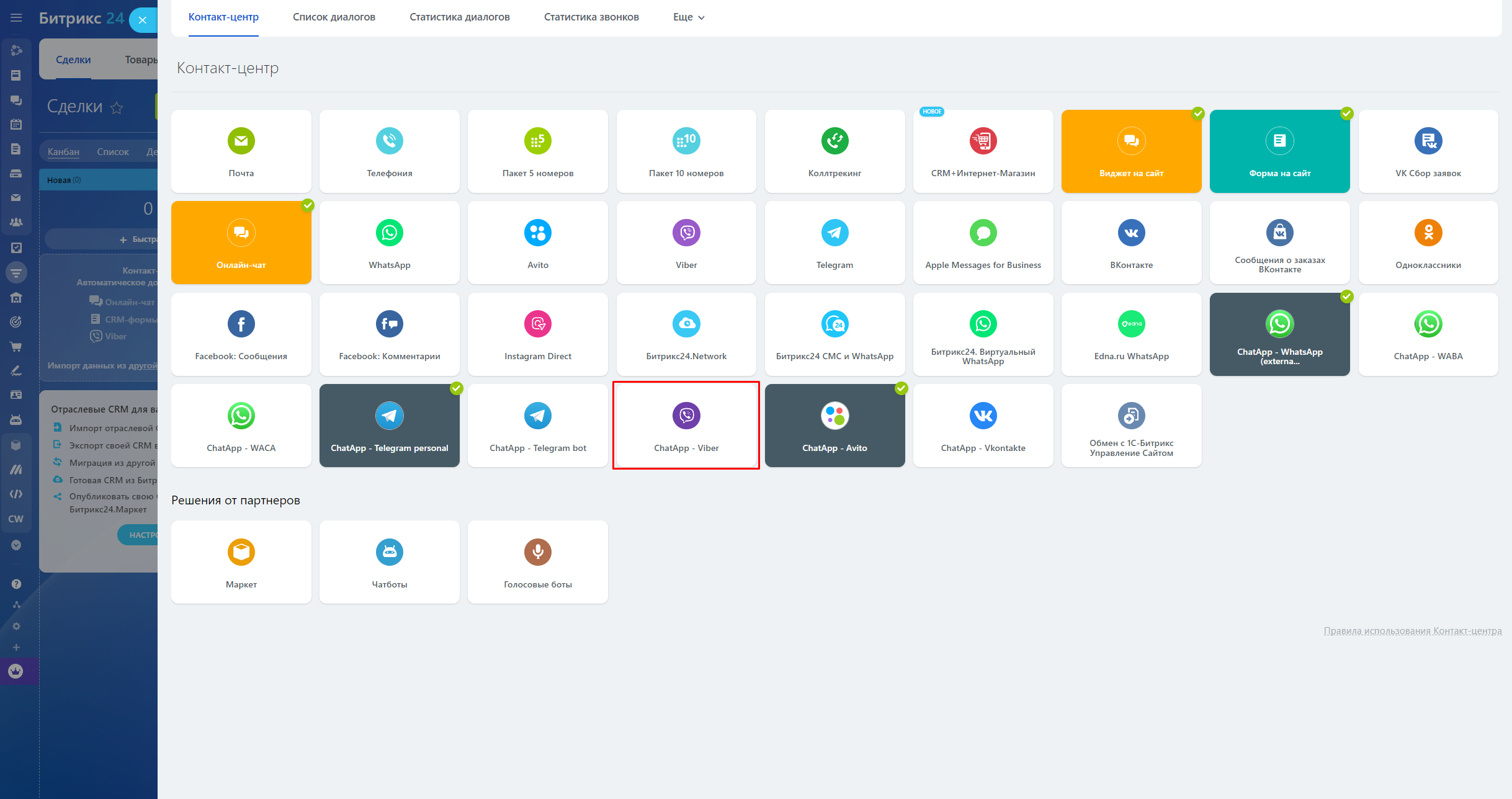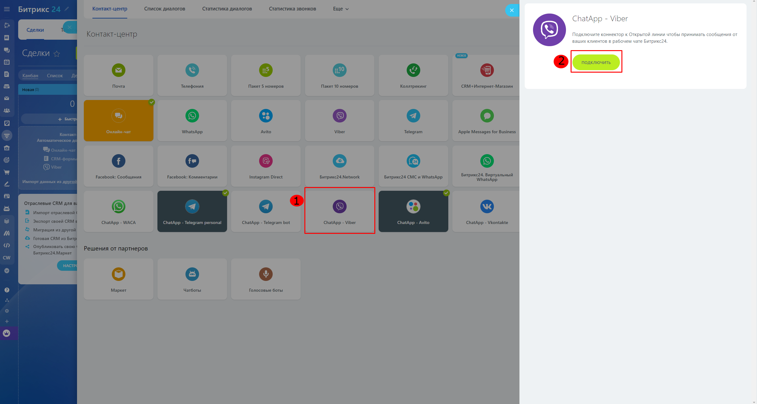 1. В разделе «Контакт-центр» в Битрикс24, нажмите на коннектор - «ChatApp - Viber».