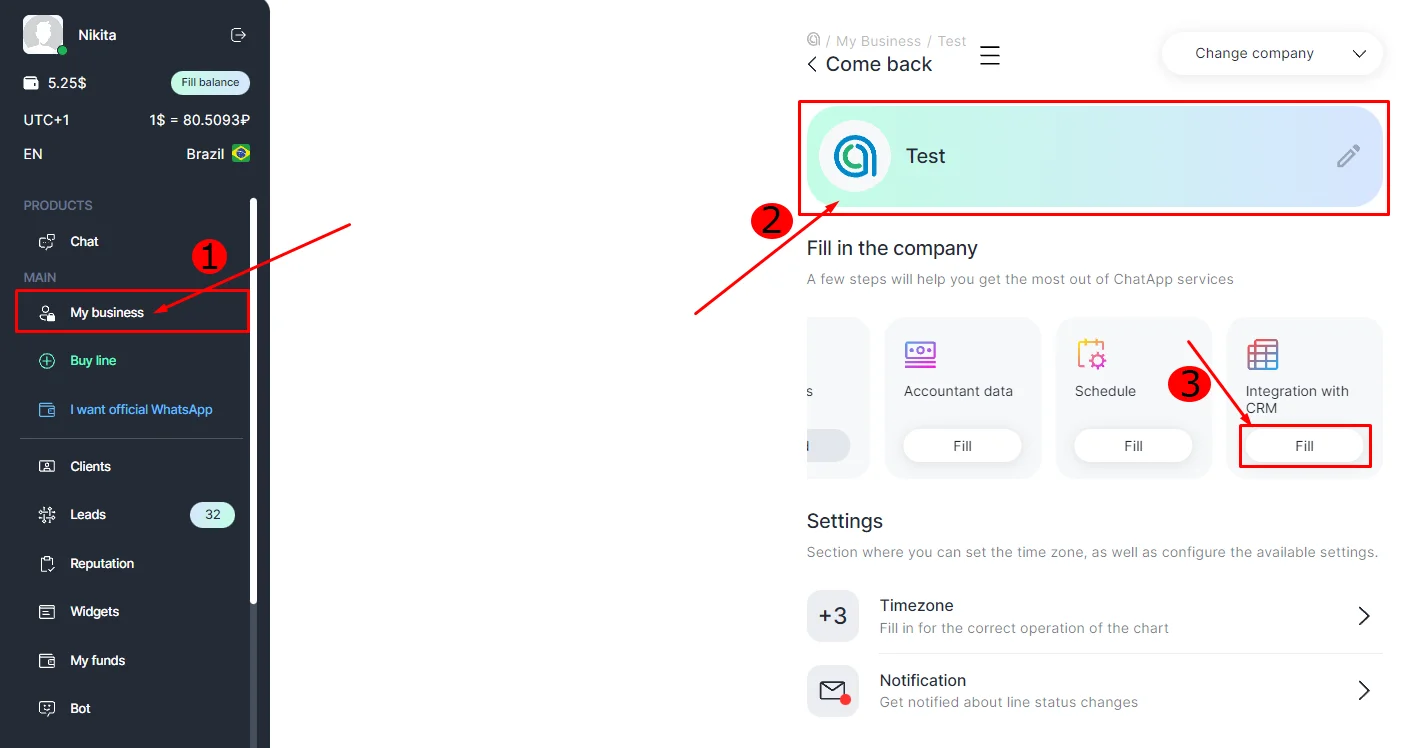 3. In your ChatApp account, click on the Selected company section in the left side menu.