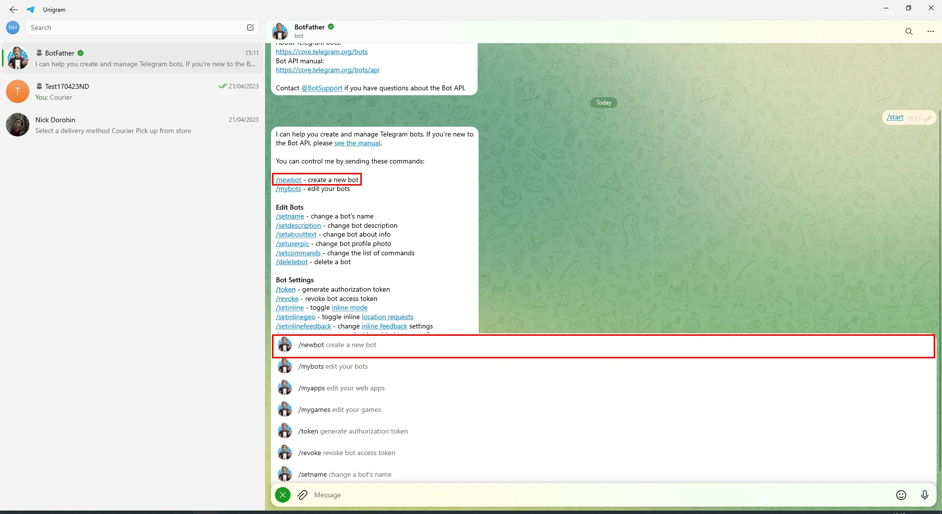 3. To create a new bot, enter a message with the text /newbot or select this item from the menu;