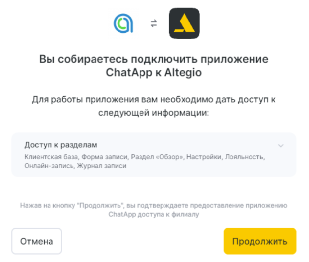 2. При подключении нужно дать согласие приложению ChataApp на обработку персональных данных. Нажмите «Продолжить».
