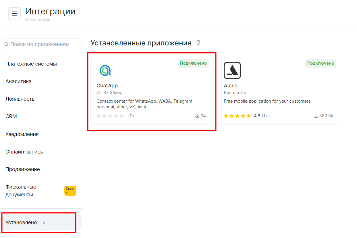 1. В разделе «Интеграции» основного меню зайдите во вкладку «Установлено».