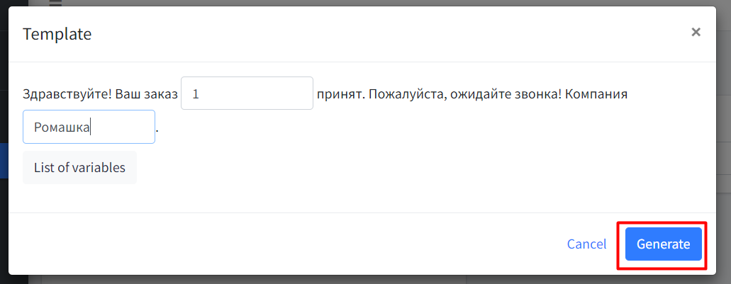 Чтобы отправить шаблон с переменными WhatsApp Busines API через Altegio:
