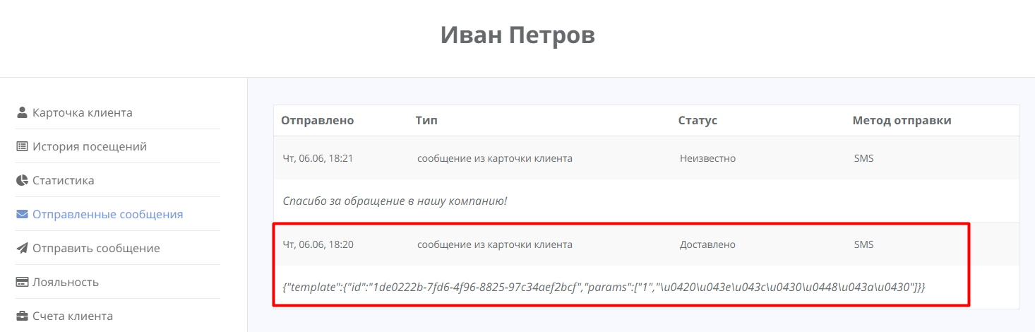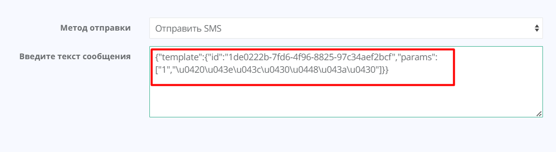 Выберите клиента, метод отправки — «Отправить SMS» и вставьте в поле сообщения код шаблона.