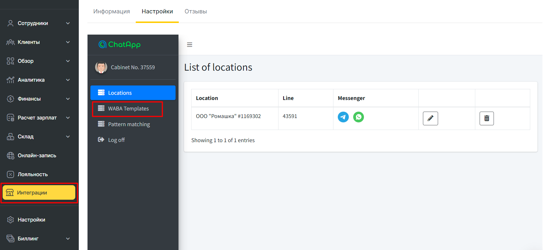 В Личном кабинете ChatApp должна быть активна интеграция с Altegio на линии, которую планируется использовать для отправки шаблонов WhatsApp Busines API.