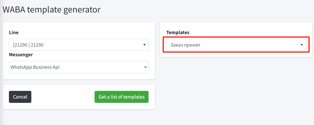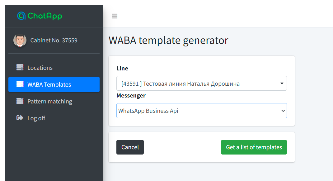 6. Зайдите в раздел WABA Templates, укажите линию и выберите WhatsApp Business API.
