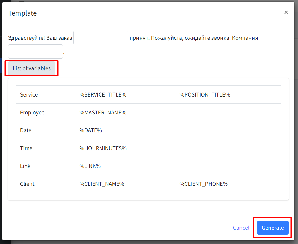 Шаблоны WhatsApp Busines API с переменными можно отправлять клиентам прямо из YCLIENTS. Перед отправкой шаблона проверьте подключение канала WhatsApp Business API и доступные шаблоны с переменными на линии ChatApp.
