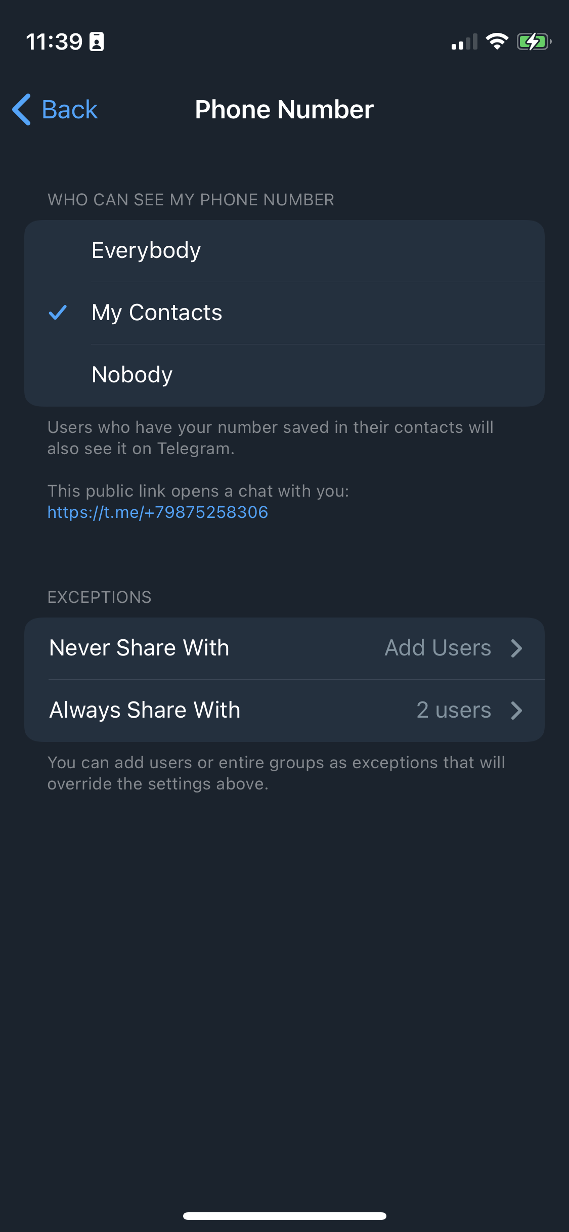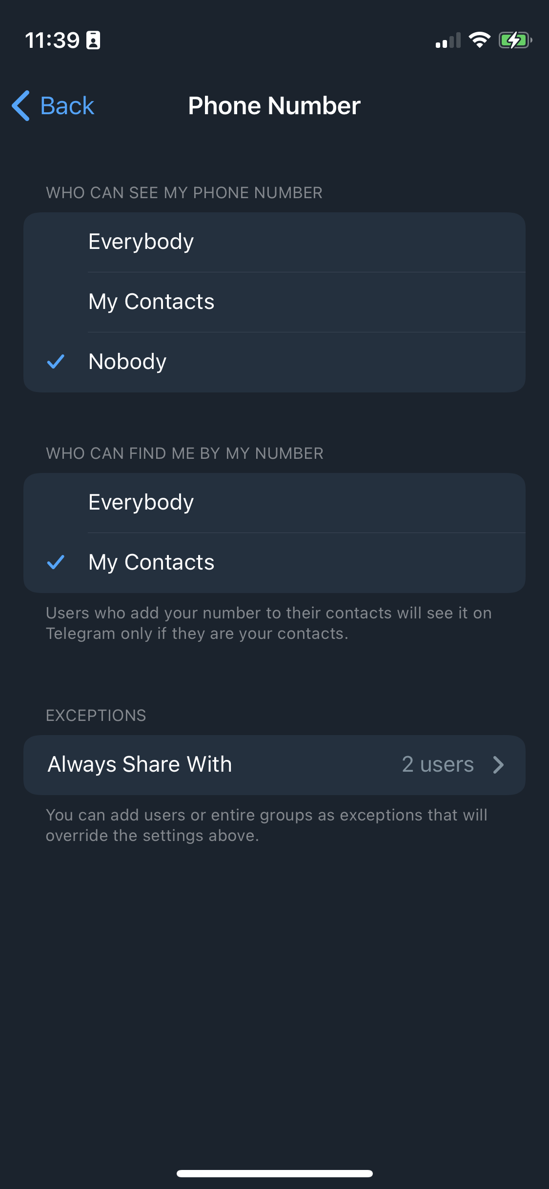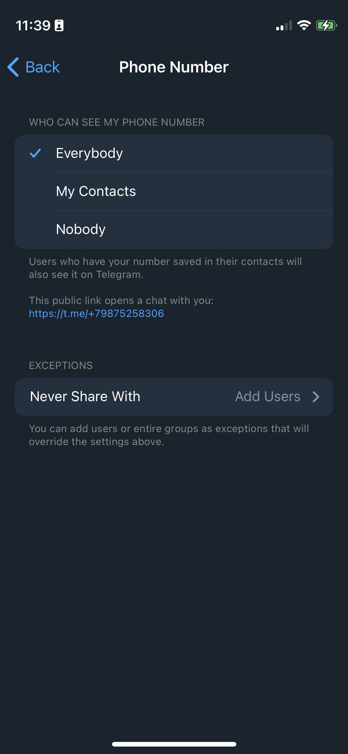 - If "Nobody" is set in the "Phone number" field in the privacy settings, then this contact cannot be contacted by phone number.