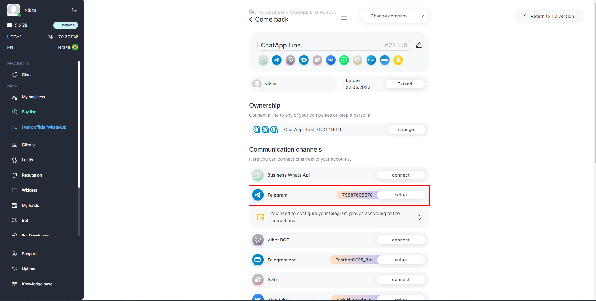 1. In your Personal account, go to the Selected company section, select the line with the connected Telegram personal.