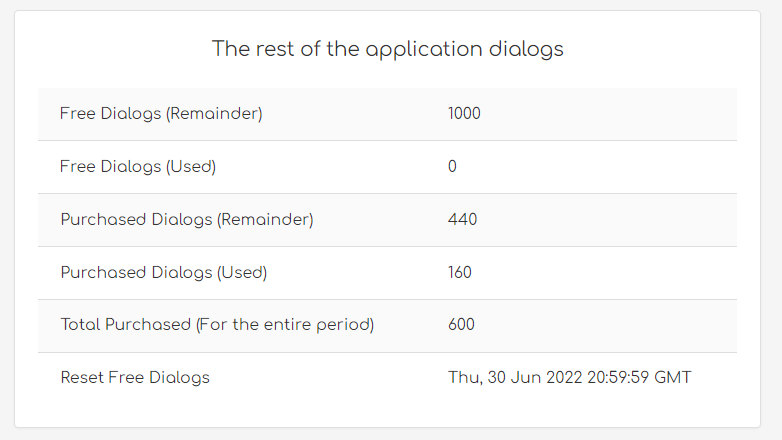 Now you can see a balance of dialogs and a date when free dialogs will expire (end of the month) in Personal Account. This will help you to predict whether the number of free dialogs is enough for a month and buy additional package if required.