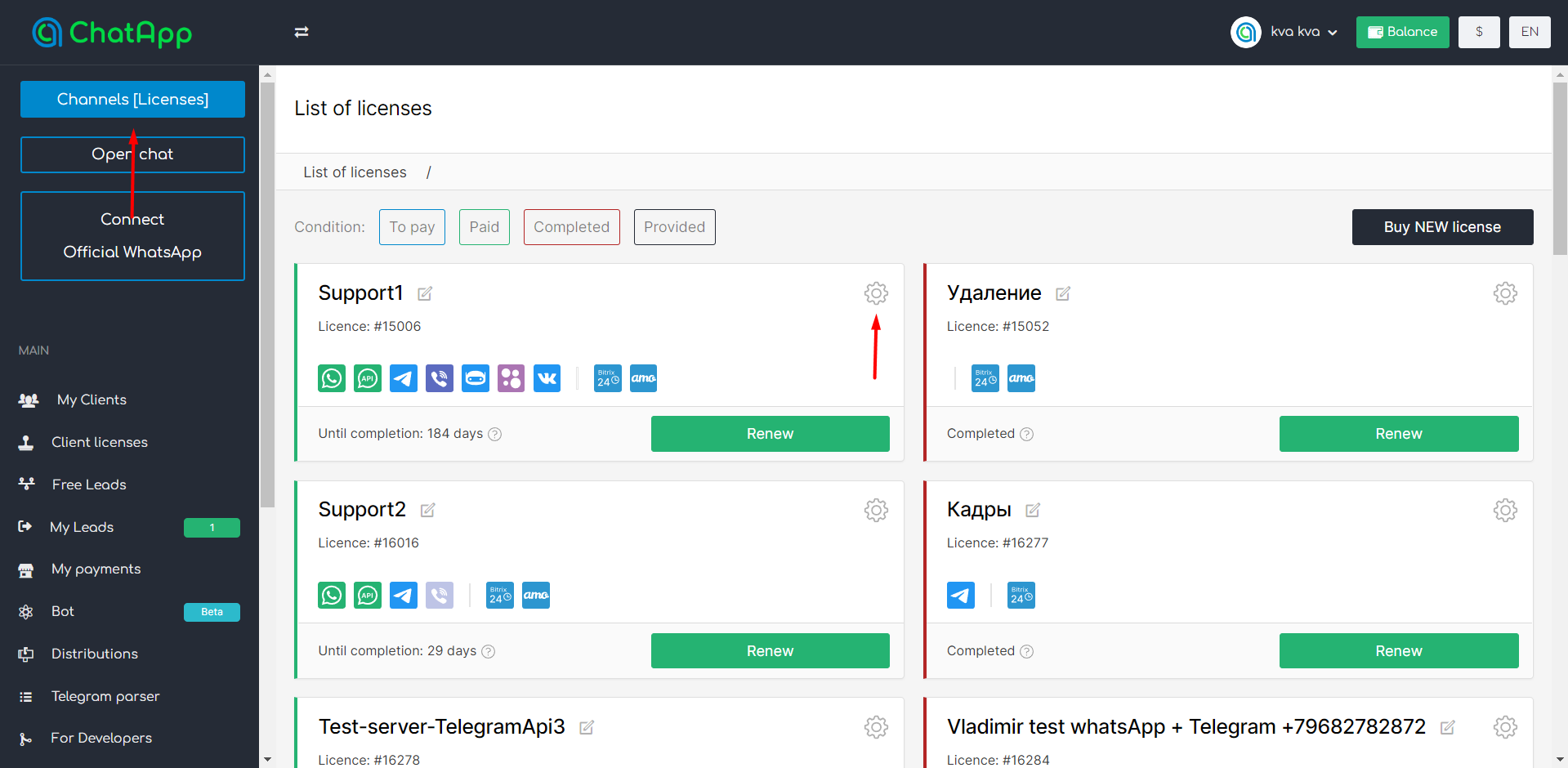 2️⃣ Purchase dialogs: Personal Account → Channels [Licenses] → Click on gear of license with WABA → Buying dialogues