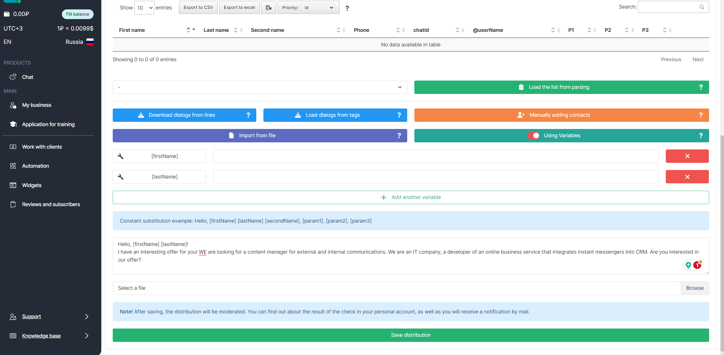 Then we set up an email campaign using this database. Service allows to use variables – they help to customize the message and avoid ban from Telegram for bulk messaging: