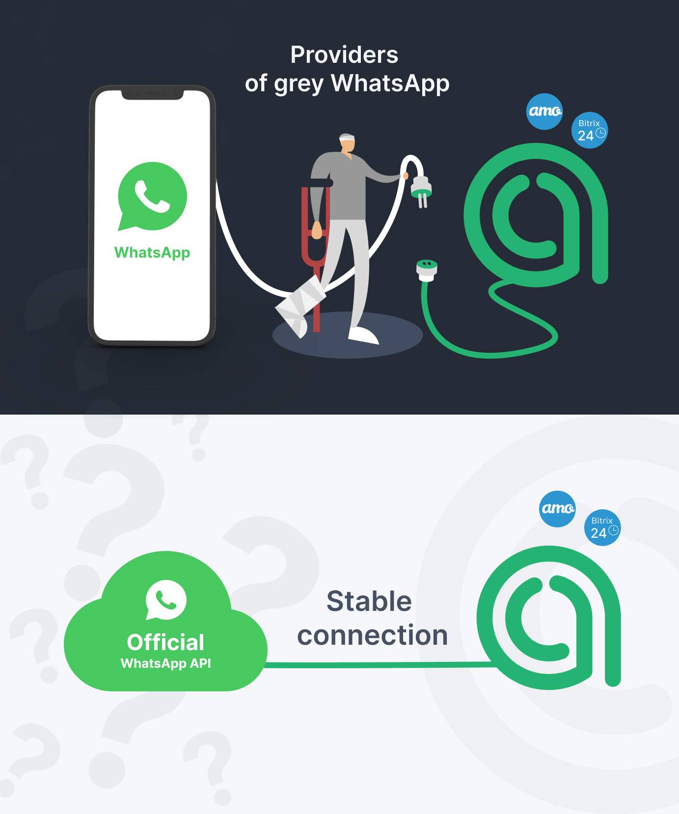 ❌"Grey" WhatsApp – it is a connection of regular number. Like all users who download the application to their phone This number is connected to CRM system and other services through a mediator.