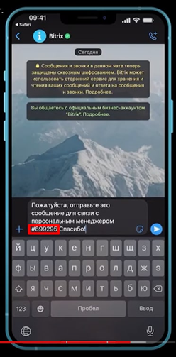 📍 Клиент должен отправить именно сгенерированное Bitrix сообщение, содержащее персональный id вашего менеджера без редактирования, иначе вы не получите сообщение клиента. Если клиент сотрет часть сообщения (например, непонятный ему номер с хештегом) или вовсе заменит на свой текст, сообщение вам не доставится.