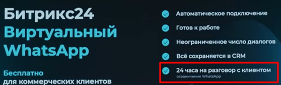 📍 Спустя 24 часа с вашим клиентом по этому номеру может общаться другая компания (и даже ваш конкурент). После закрытия диалога (через 24 часа), ваш клиент, написав через виджет на сайте любой другой компании, тоже пользующейся Виртуальным WhatsApp от Bitrix может с удивлением обнаружить свою переписку - продолжением вашего с ним диалога. Т.е. спустя 24 часа с вашим клиентом вполне может общаться с того же номера, но другого id уже ваш конкурент.