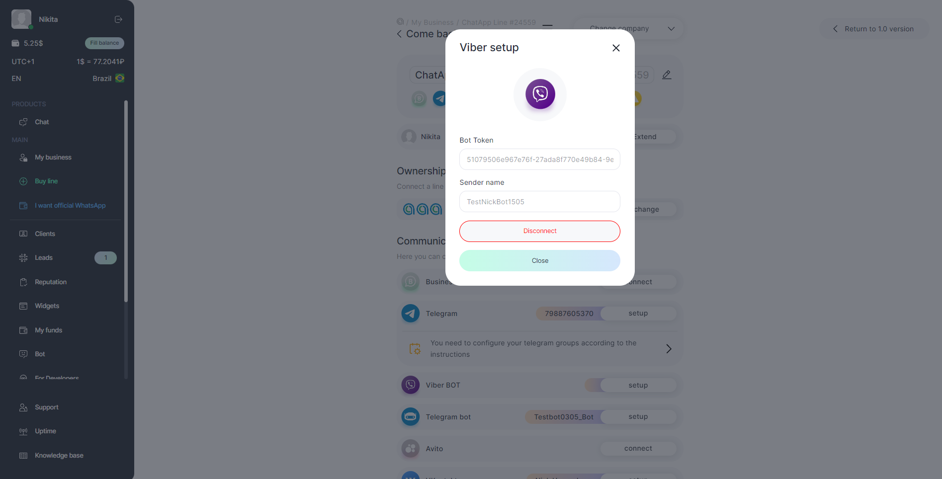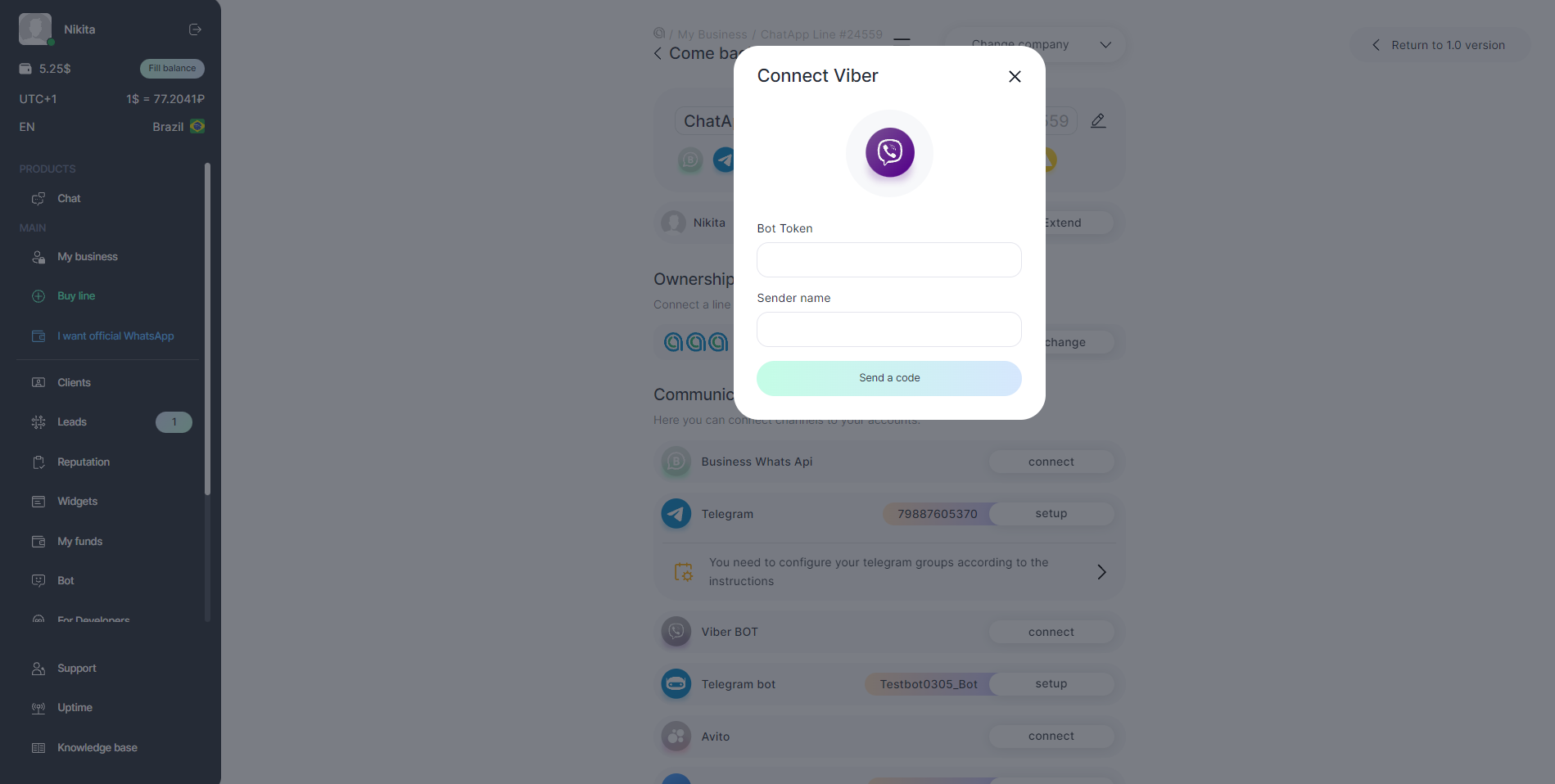 To receive and reply to messages from Viber, after registering in ChatApp, you need to buy a line with the Viber bot channel and set up the bot connection: