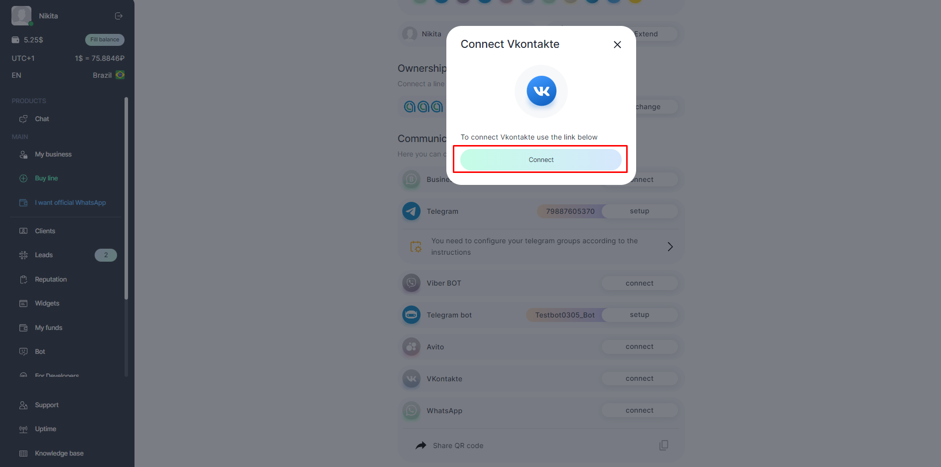 2. Click Connect in front of VK (VKontakte) section.
