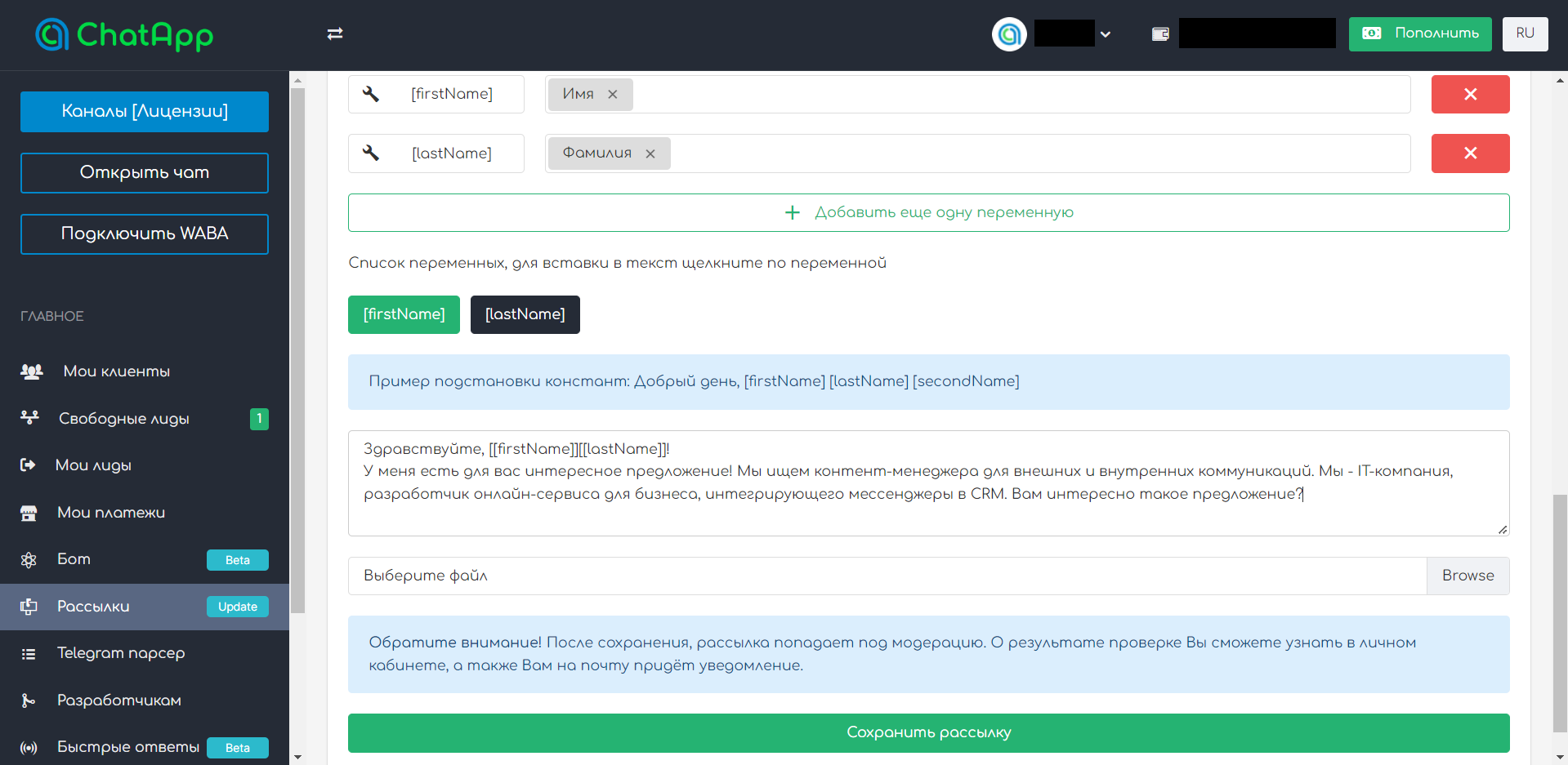 Далее мы настраиваем рассылку по этой базе. В сервисе можно использовать переменные – с помощью них мы персонализируем сообщение и избежим бана от Telegram за массовую рассылку: