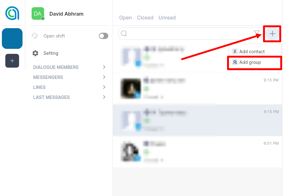 2. Click the «+» button in the list of all dialogs.