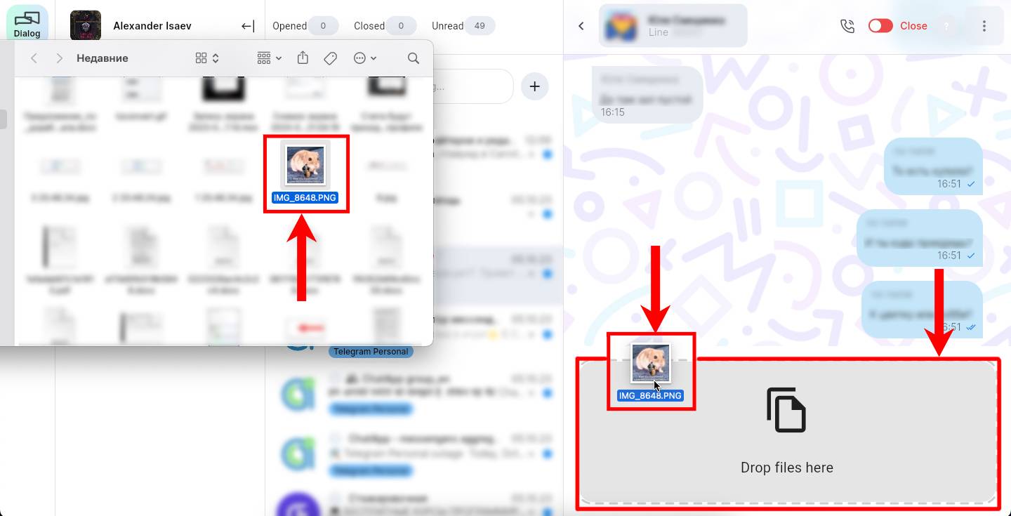 You can send files from a single messenger window. This can be done in one of three ways: