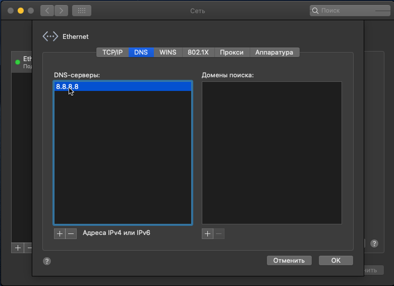 5) Click + and add the following DNS server address: 8.8.8.8.