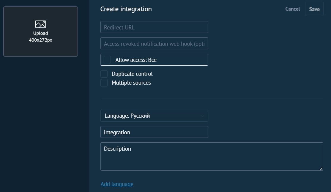 Create external integration on the AmoMarket page