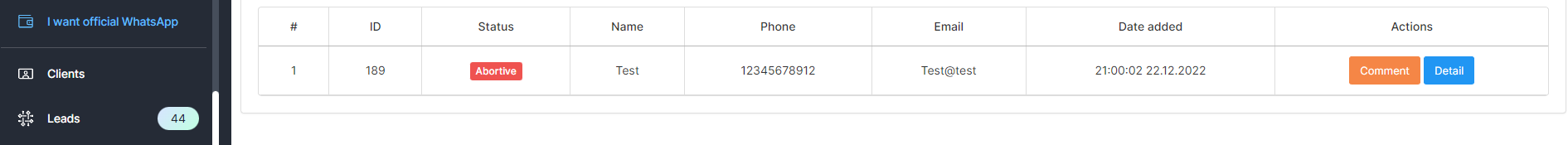 - Click on the «Detail» button to work with the Lead.