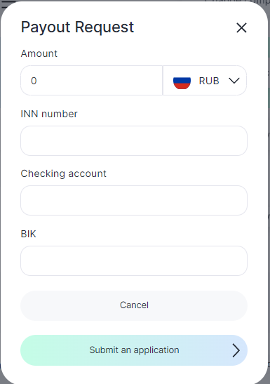 - In the pop-up window enter the amount to be withdrawn. Withdrawal of funds is currently possible only on the territory of the Russian Federation and only in the currency Rubles. The minimum amount is 5000 rubles.