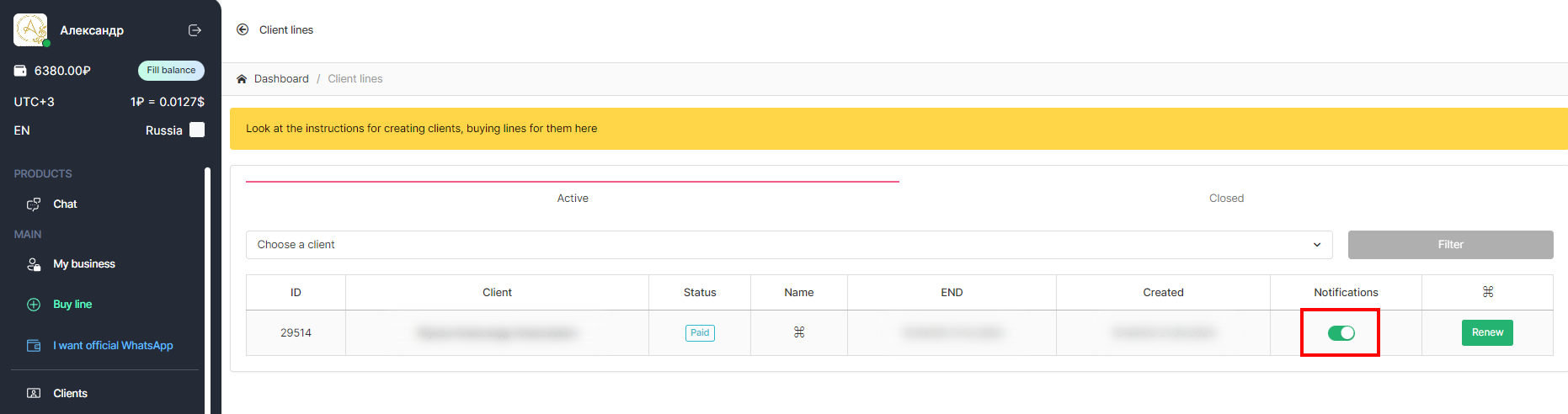 - In Personal Account in Client licenses section, turn on «Notifications»: