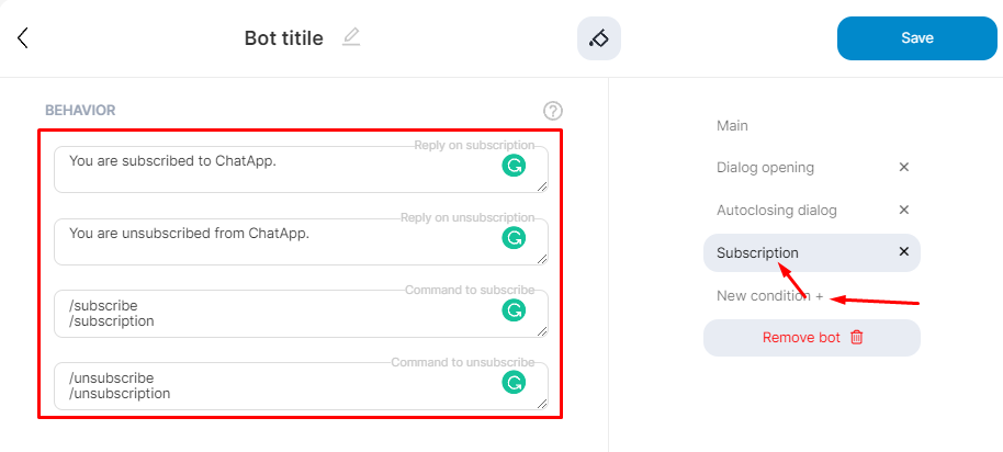 Reply on subscription - this is the phrase that the bot will send when the client subscribes to a particular messenger. You can specify an appreciation or give any promotional code for using your service.