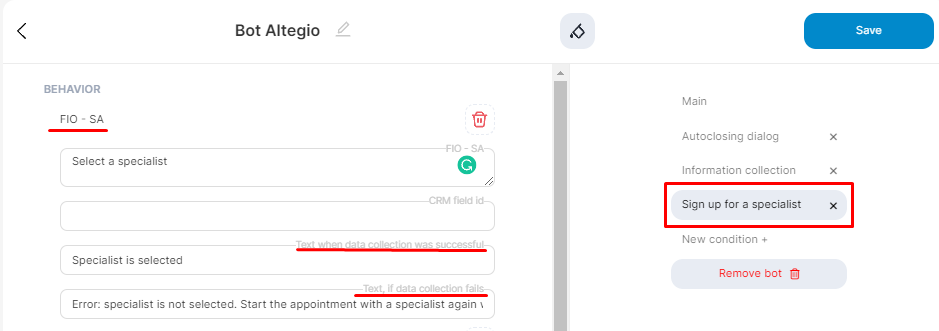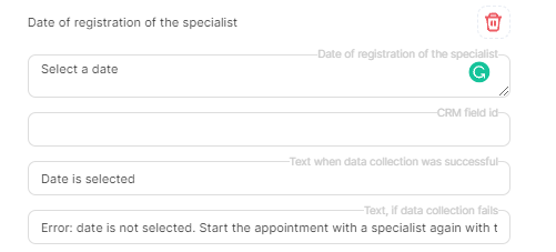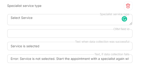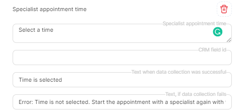 In the "Text, if data collection fails" field, write that the data was entered incorrectly, and tell the client how to start recording again. For example, Incorrect data was entered. Start an appointment with a specialist by writing Start again.