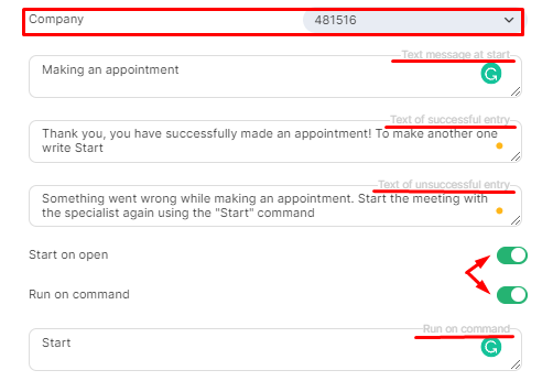 In the Run on command field, write a word or phrase, after entering this command, the client will start making an appointment.