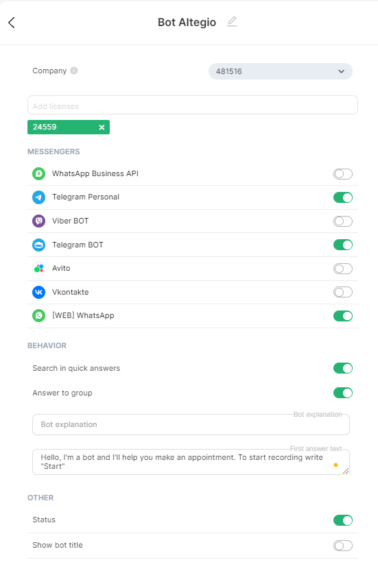 Choose in which licenses the BOT will work. Make sure that the selected messengers are linked to the license