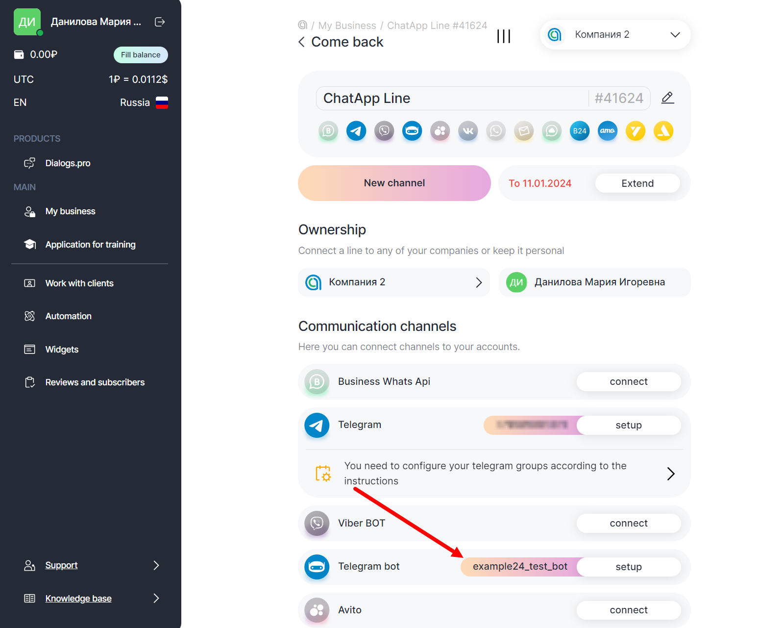 1. Make sure that your Telegram bot is connected to the company line in your Personal Account.