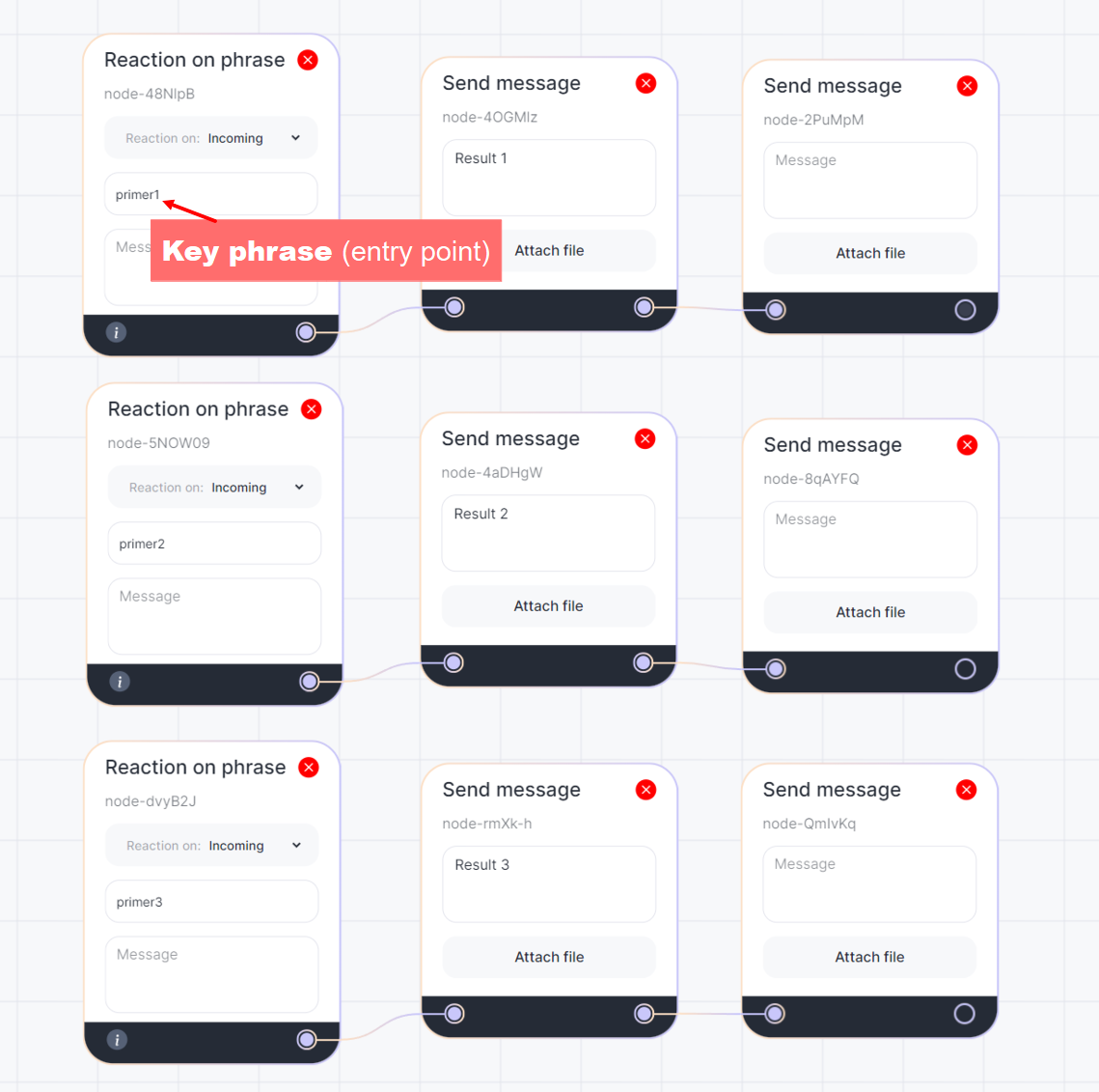 3. Create a script according to your wishes and requirements. In the “Reaction to phrase” block, add a keyword that will be used in the deep link. Add an appropriate block with feedback from the bot, for example, “Send a message”.