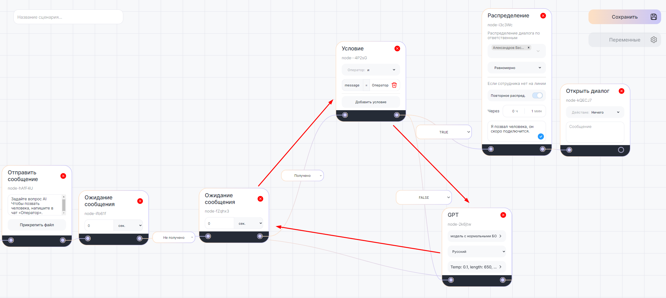 The scenario in the screenshot is cyclical, and ChatGPT will respond to messages until the client calls for an operator.